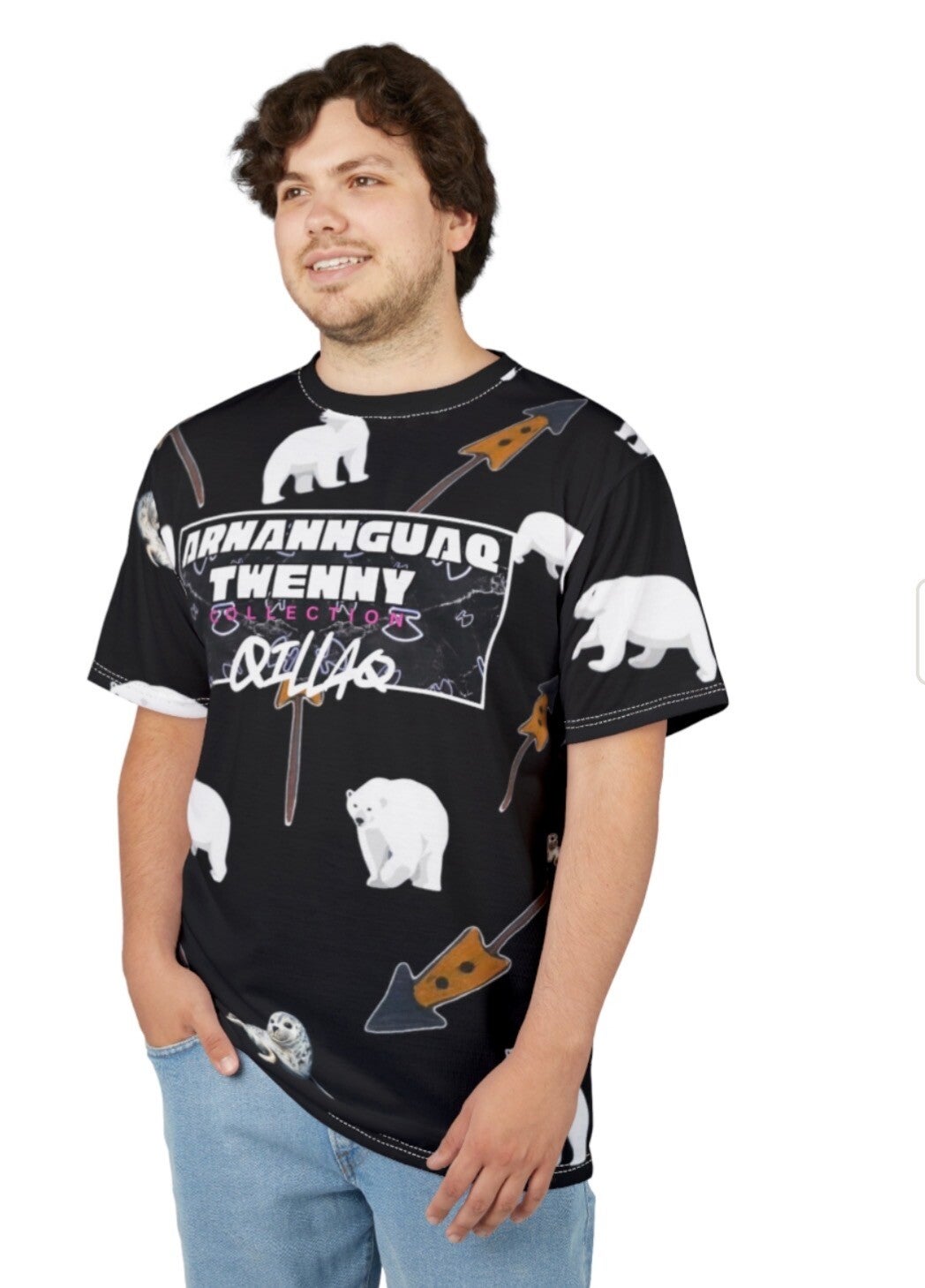 Blød og holder den sorte baggrund dyb, mens hvide isbjørne, sæler gentages på tværs af T-shirten for et grafisk, historiedrevet look